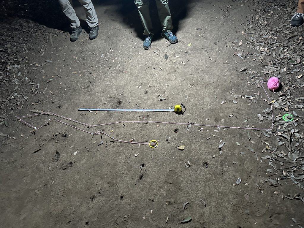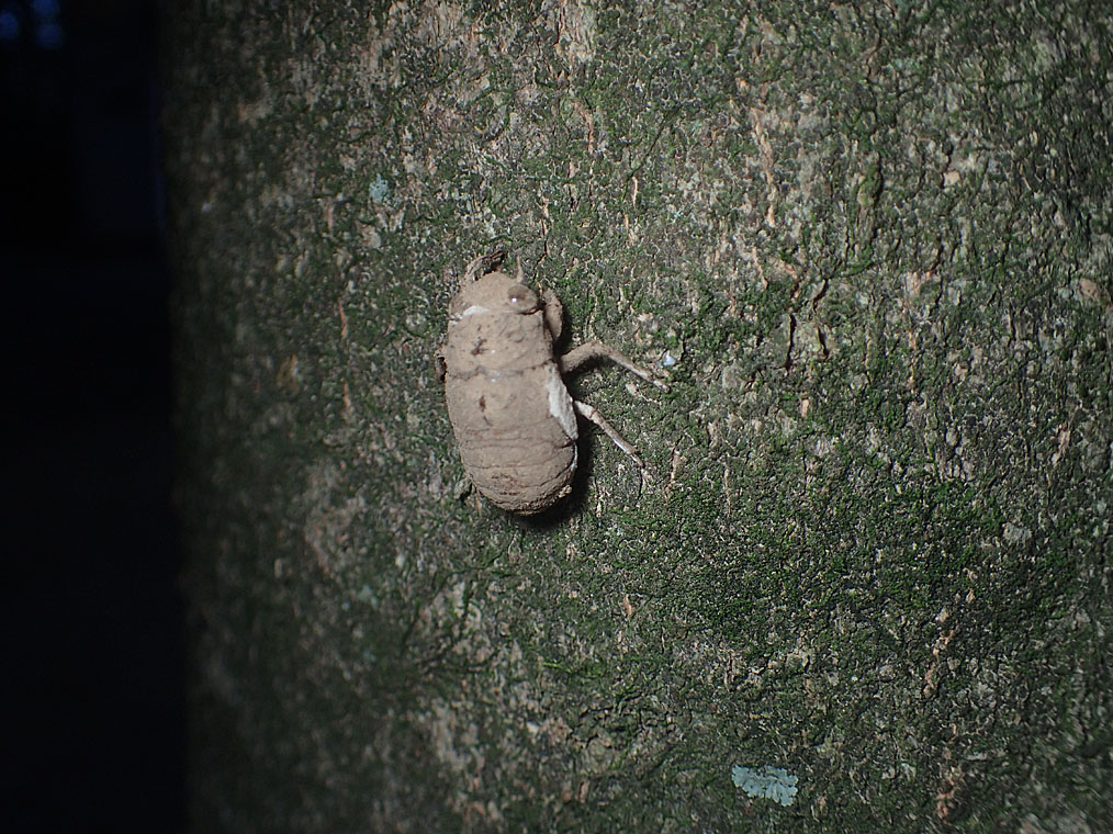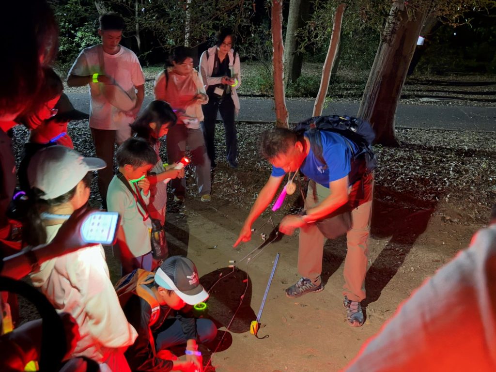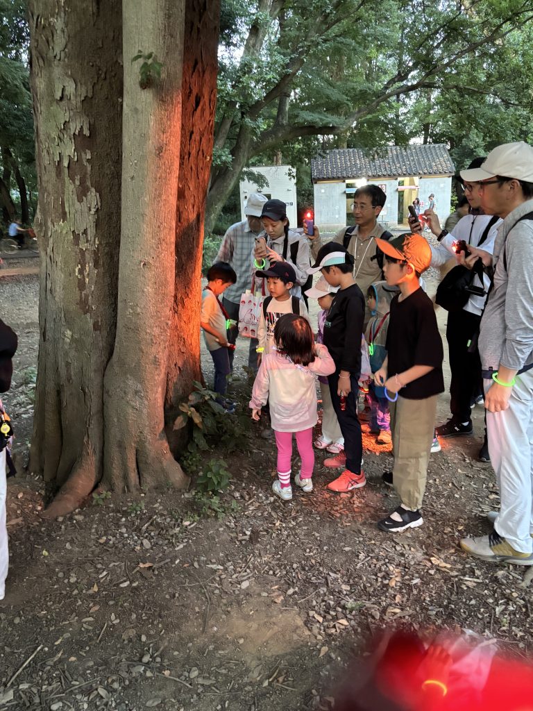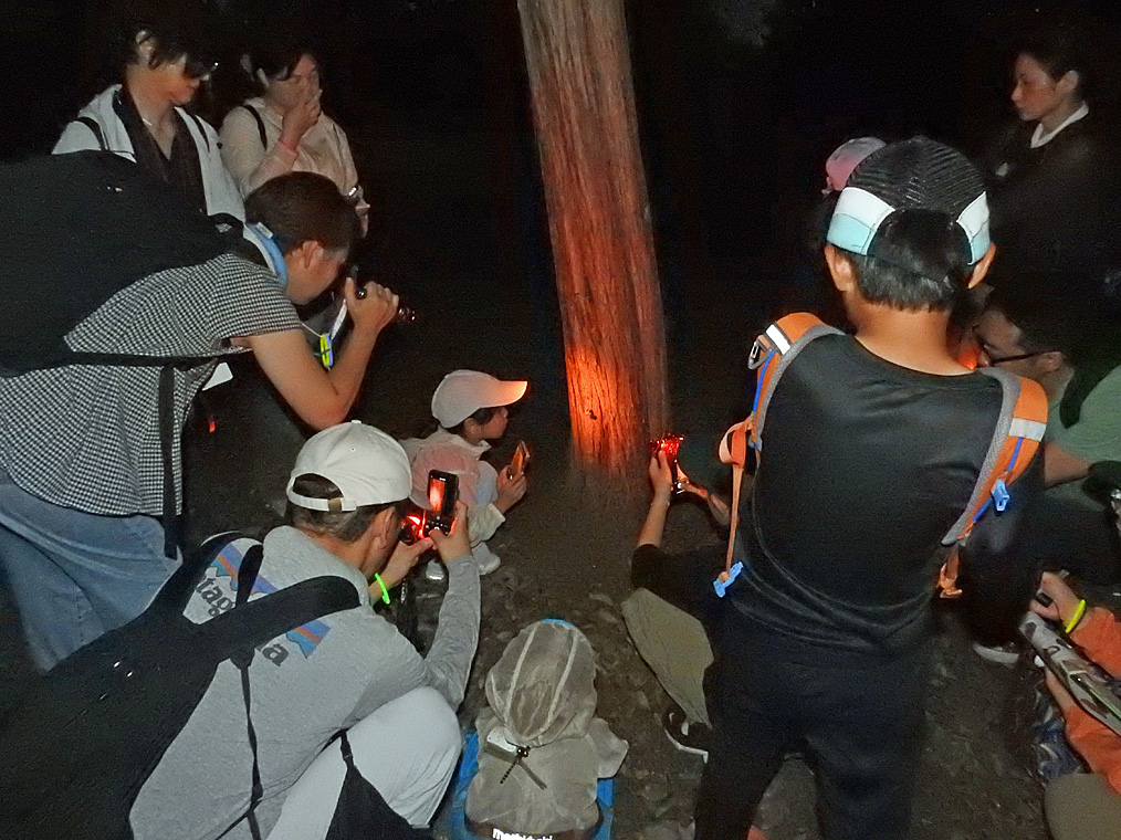 羽化観察をしている間もスタッフ数名がニイニイゼミとアブラゼミの幼虫の追跡を継続して軌跡を印すことができ、羽化観察の後にニイニイゼミとアブラゼミの幼虫の歩いた軌跡を参加者とともに観察でき、アブラゼミの幼虫は発見した箇所から木に登ったところまでの軌跡を観察できました。最後に全員で集合した場所で地面を歩くアブラゼミ幼虫が突如出現。こういう幼虫が園路に出てきて踏まれていることを伝え、参加者の感想を聞いて解散。セミの幼虫はすぐに木に登ると思っていたけど違うと知り驚いたという参加者もいました。夜の公園での観察をみんなで楽しむことができました。