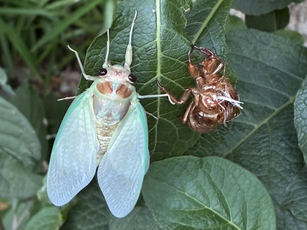 羽化しようとしているニイニイゼミ幼虫を観察。みんな目が釘付けに!タイミングよくお尻が殻から出るところまで観察できました。