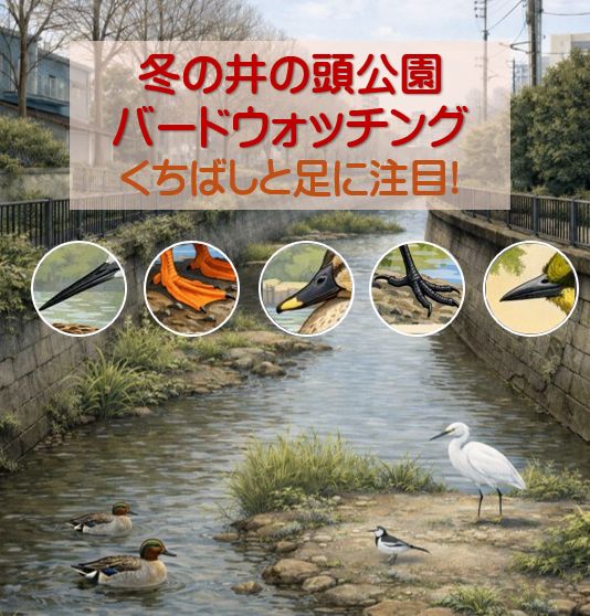 今回は「嘴と足」に注目し、鳥たちの食べ方や歩き方、くらしの違いを観察します。神田川の水路ではカルガモやコガモ、コサギ、タシギ、ハクセキレイ類を、公園内ではシジュウカラ、メジロ、エナガ、ツグミ、コゲラなど、身近な野鳥を探します。カモ類が少ない年ならではの視点で、形に隠された意味を読み解く観察会です。初心者の方も大歓迎です。